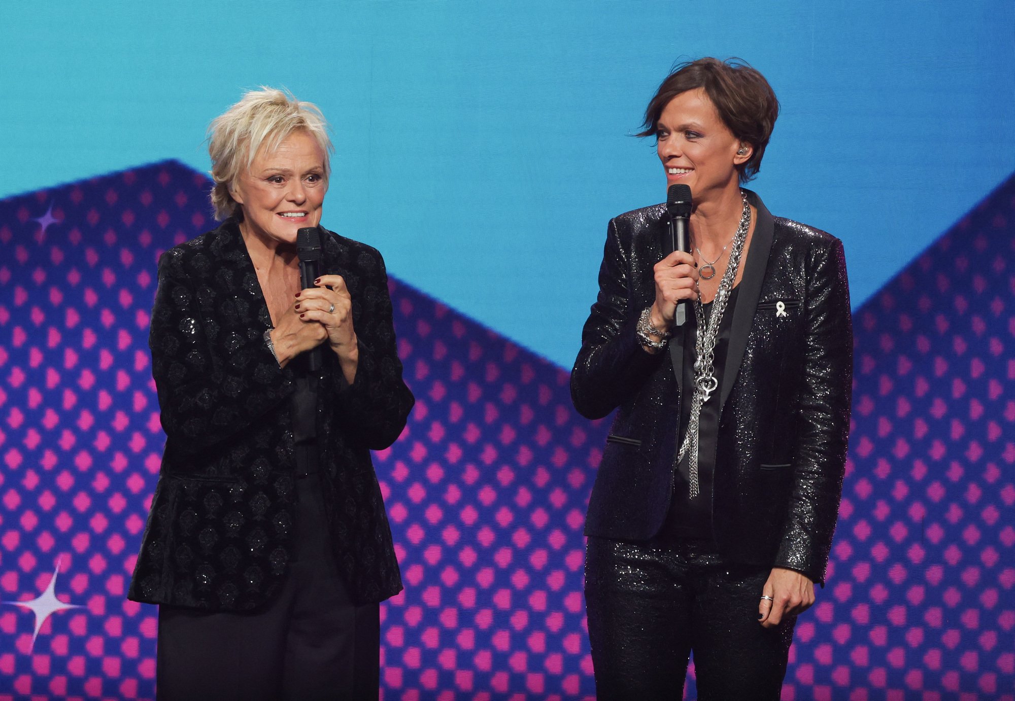Sur la scène de cette nouvelle salle parisienne, Muriel Robin a retrouvé son épouse Anne Le Nen. C'est ensemble qu'elles ont animé cette grande soirée, toutes les deux vêtues entièrement de noir. L'humoriste et actrice avait misé sur un tailleur sobre avec une veste à sequins tandis que sa femme avait agrémenté sa tenue d'un collier XXL qui lui ajoutait un côté très rock'n'roll. Pour elles, être de nouveau les présentatrices de ce concert était comme une évidence.