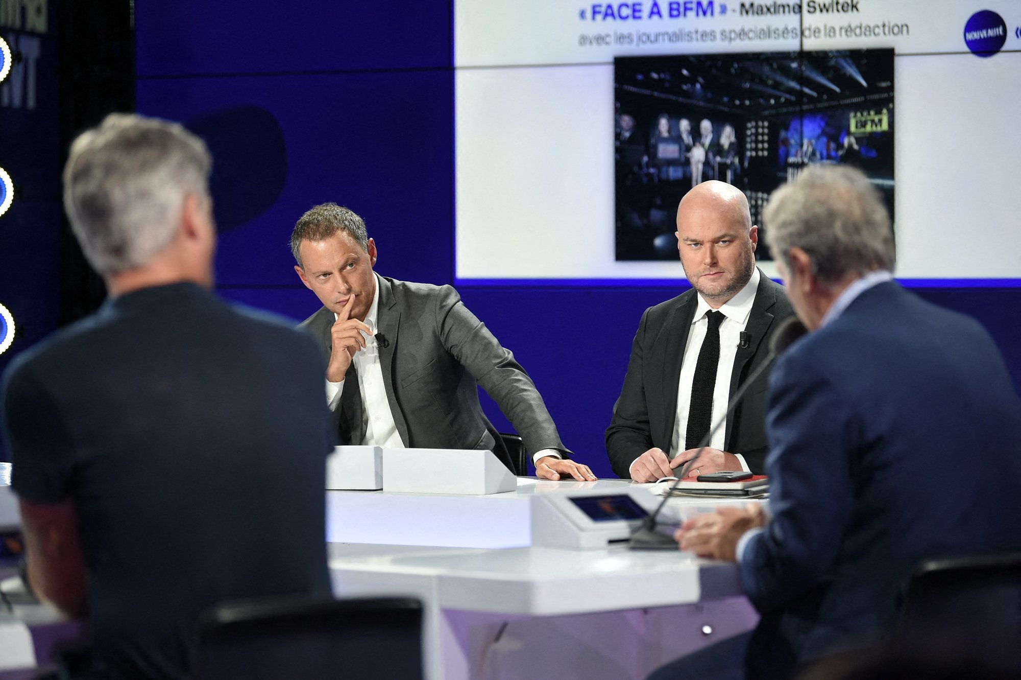 Philippe Corbé quitte Radio France Marc-Olivier Fogiel et Philippe Corbe lors de la conférence de presse de BFM TV à Paris, France. Photo by Eliot Blondet/ABACAPRESS.COM - © Abaca Press, Blondet Eliot/ABACA